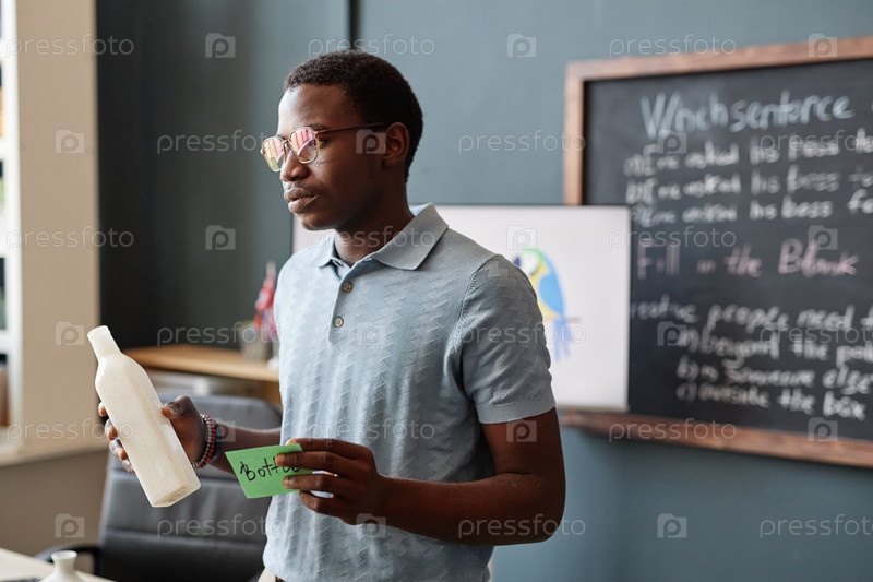 Инструктор по английскому языку держит бутылку и наклейку, представляя классу новые слова