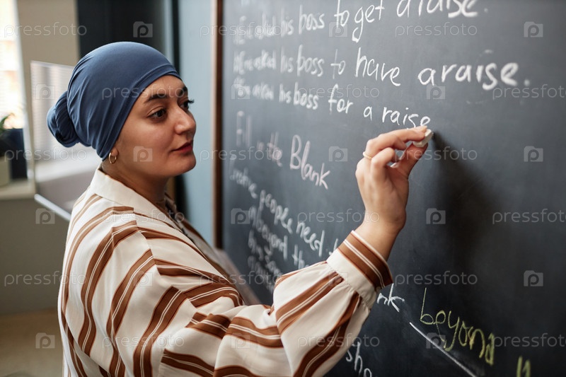 Мусульманка, которая пишет предложения на чернильной доске Изучает английский язык в классе