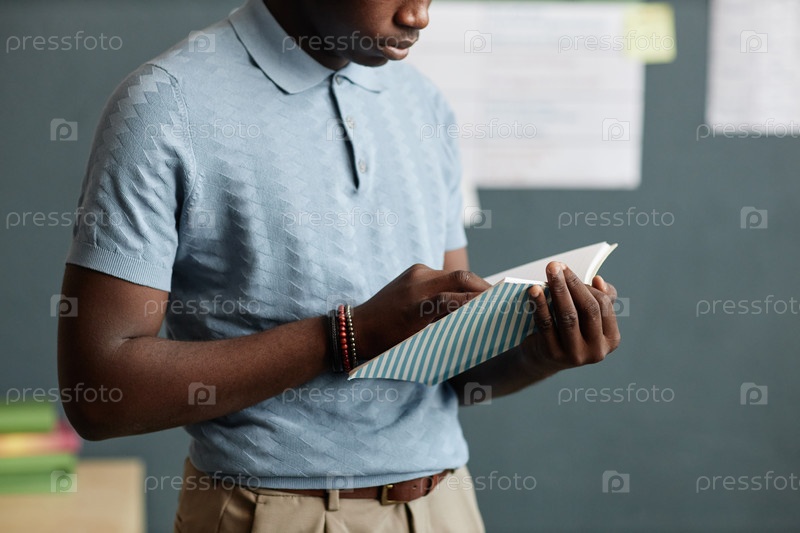 Афроамериканский студент, держащий блокнот Читать заметки во время учебы в классе