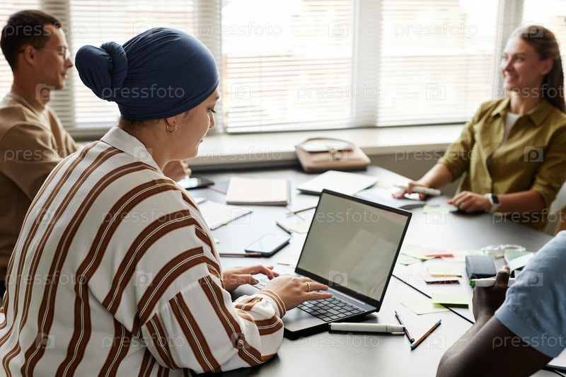 Взрослая студентка использует ноутбук для учебы, сидя за столом в групповом классе внутри дома