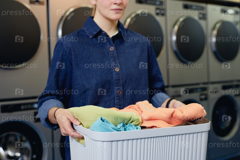 Молодая женщина держит корзину с одеждой для стирки в общественной прачечной