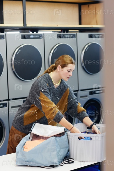Девушка сортирует бельё в корзину Готовится мыть одежду на прачечной