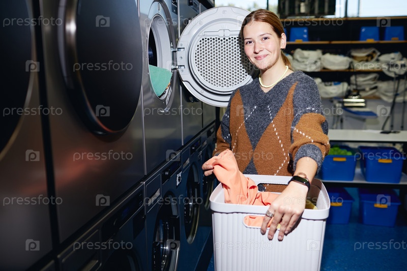 Портрет улыбающейся девушки, загружающей одежду в стиральную машину на общественной прачечной