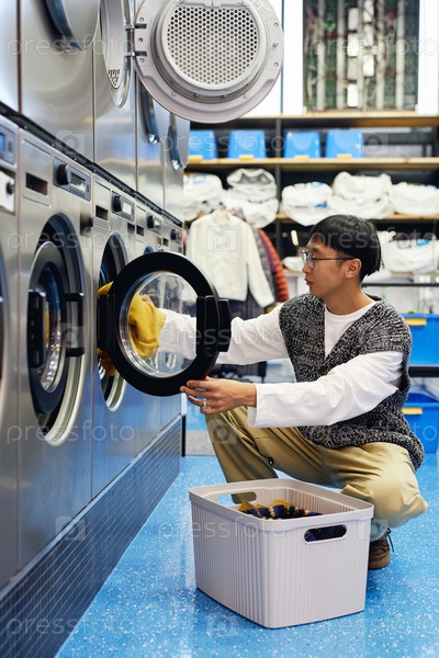 Азиатский мужчина загружает грязную одежду в стиральную машину на монетной прачечной