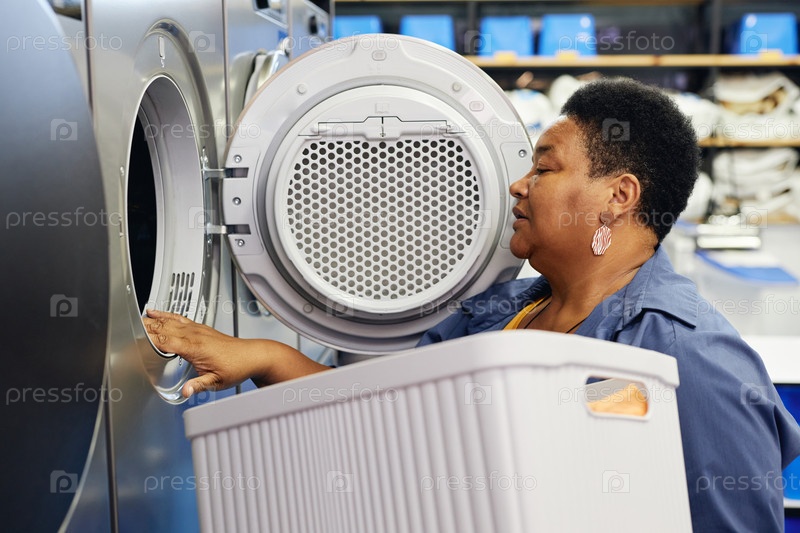 Старшая чернокожая женщина кладет одежду из корзины в стиральную машину на общественной прачечной