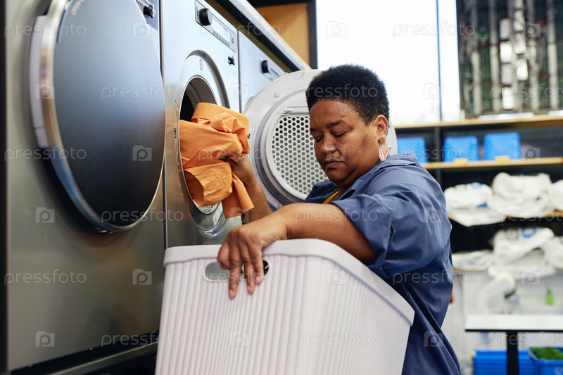 Старшая чернокожая женщина помещает одежду из корзины в стиральную машину на прачечной самообслуживания
