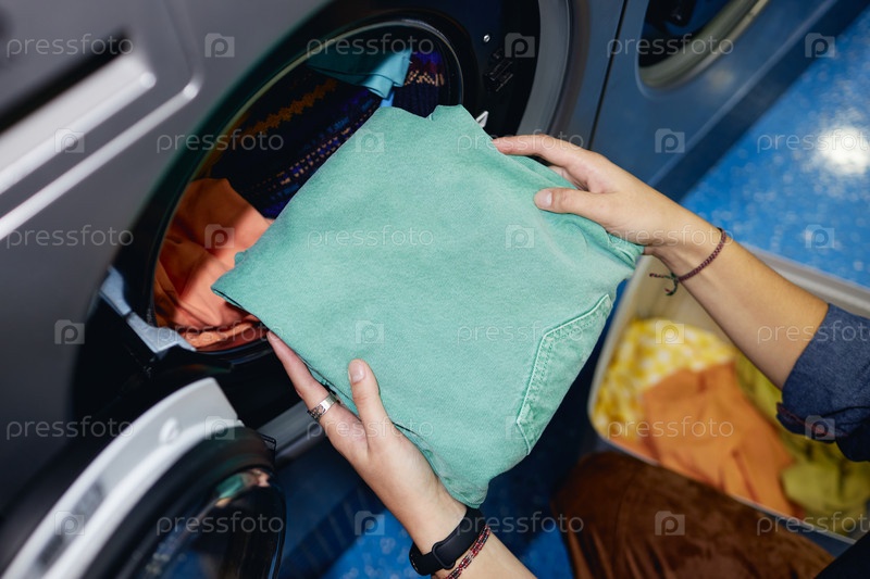 Женщина кладет джинсы в стиральную машину в прачечной самообслуживания