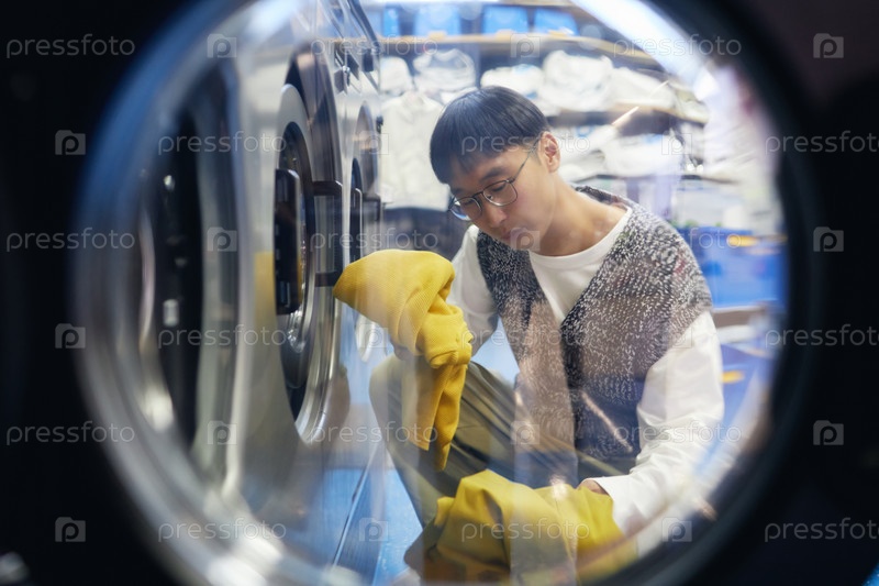 Азиатский мужчина через дверь стиральной машины разгружает одежду в прачечной самообслуживания