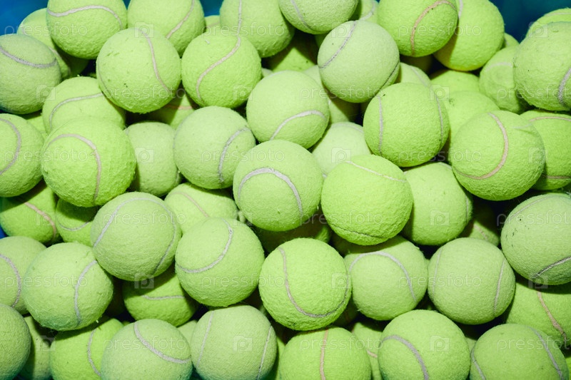 Куча зеленых теннисных мячей в коробке внутри