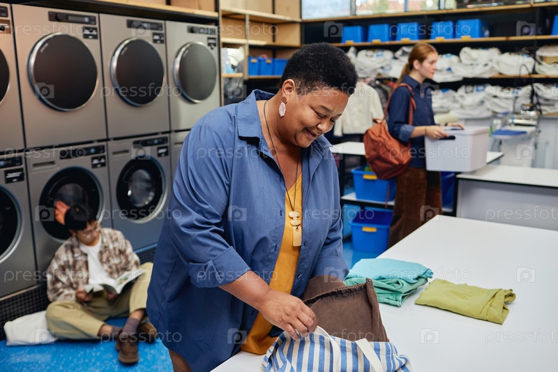 Улыбающаяся старшая чернокожая женщина упаковала одежду в сумку после мытья в монетной прачечной