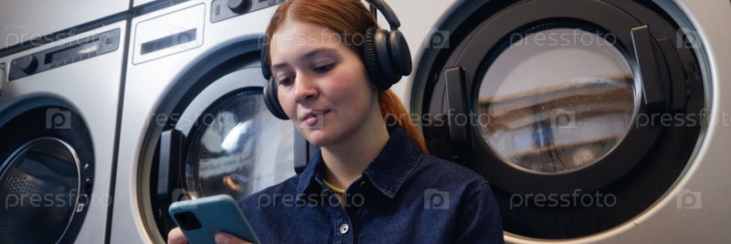 Header Image of Woman Listening to Music through Headphones while Waiting at Laundromat Женщина слушает музыку через наушники во время ожидания в прачечной