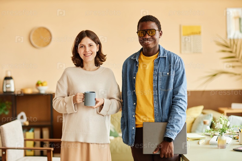 Портрет двух счастливых многонациональных коллег, позирующих в офисной комнате
