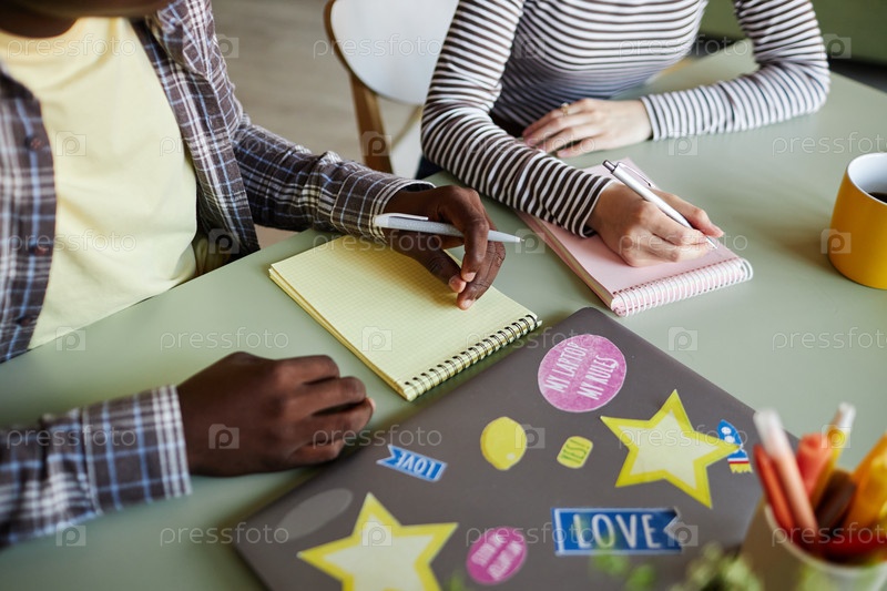 Руки двух сотрудников, пишущих на блокнотах за рабочим столом в офисе