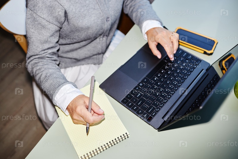 Старшая деловая женщина, использующая ноутбук при написании в блокноте Работа на столе внутри