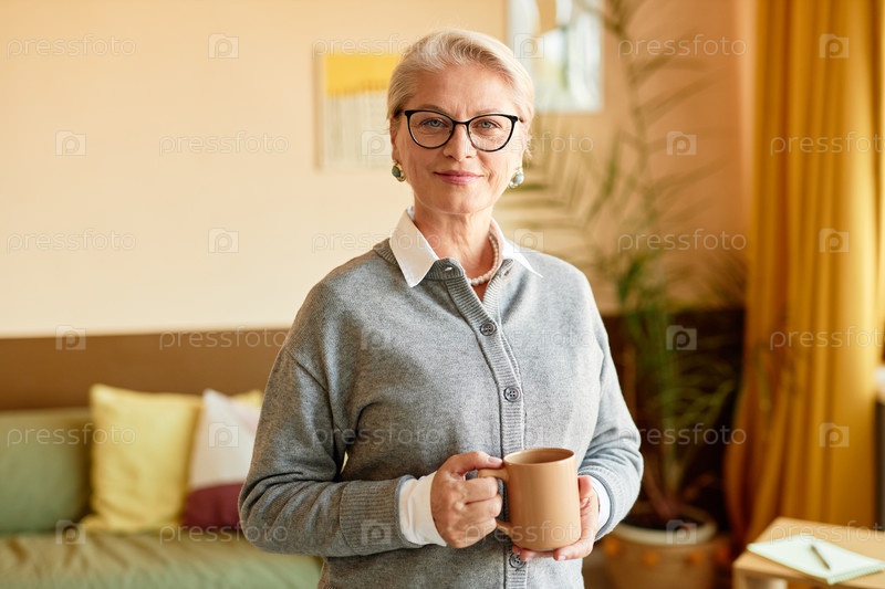 Портрет улыбающейся пожилой женщины, позирующей с кружкой кофе в домашнем офисе