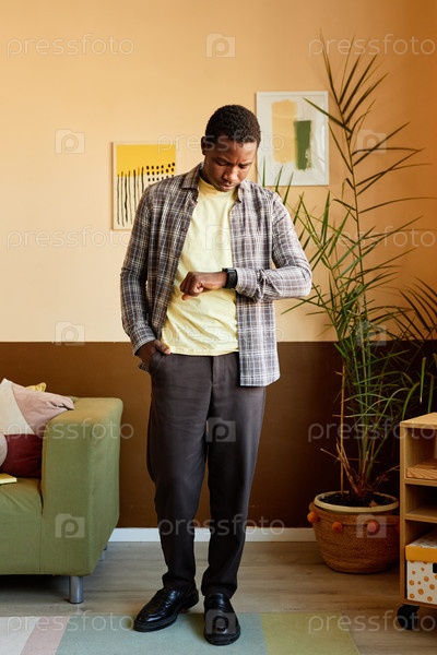 Афроамериканский бизнесмен в обычной рубашке Проверка времени Смотря на часы внутри