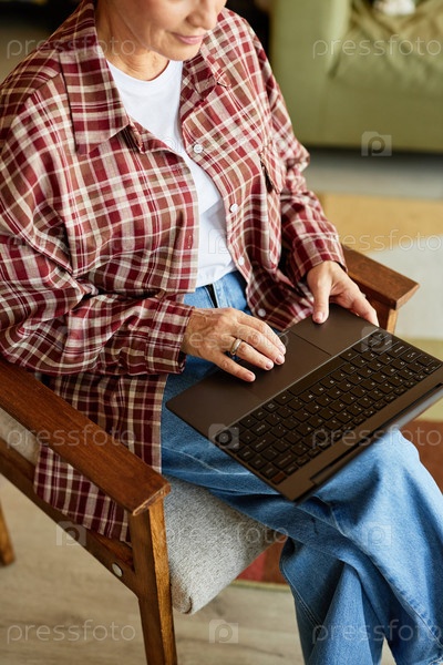 Руки старшей бизнес-жены, использующей ноутбук во время сидения на стуле в домашнем офисе