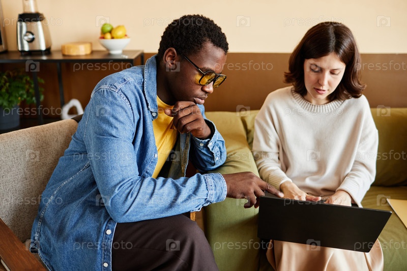 Афроамериканский офисный работник-мужчина помогает коллеге-женщине с помощью ноутбука в помещении