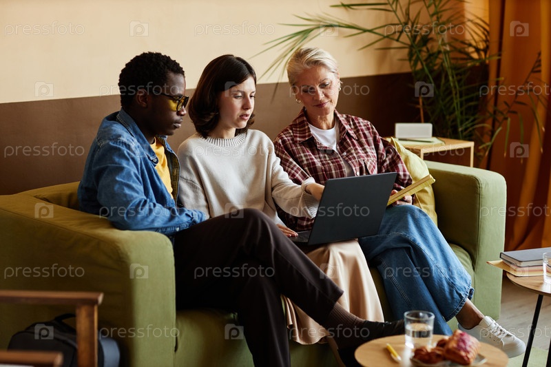 Разнообразная команда сотрудников, указывающих на ноутбук во время рабочей встречи на диване в помещении