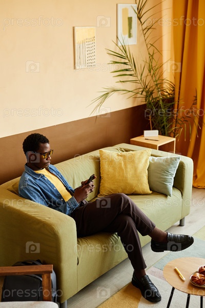 Модный молодой чернокожий мужчина использует телефон, сидя на диване в офисе