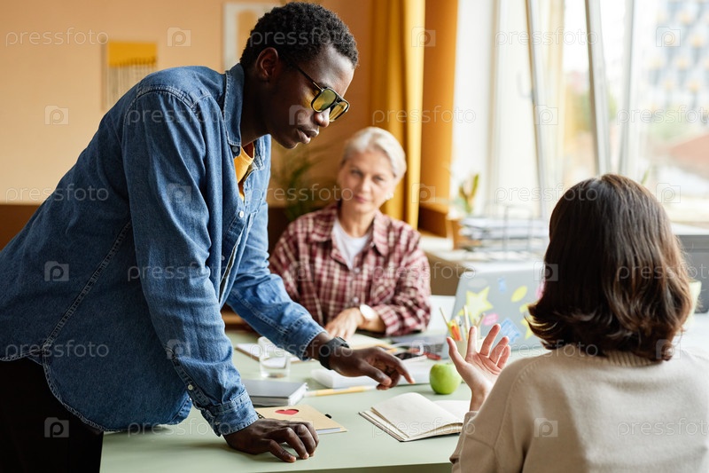 Чернокожий мужчина в очках разговаривает с коллегой Стоя рядом с рабочим столом в офисе