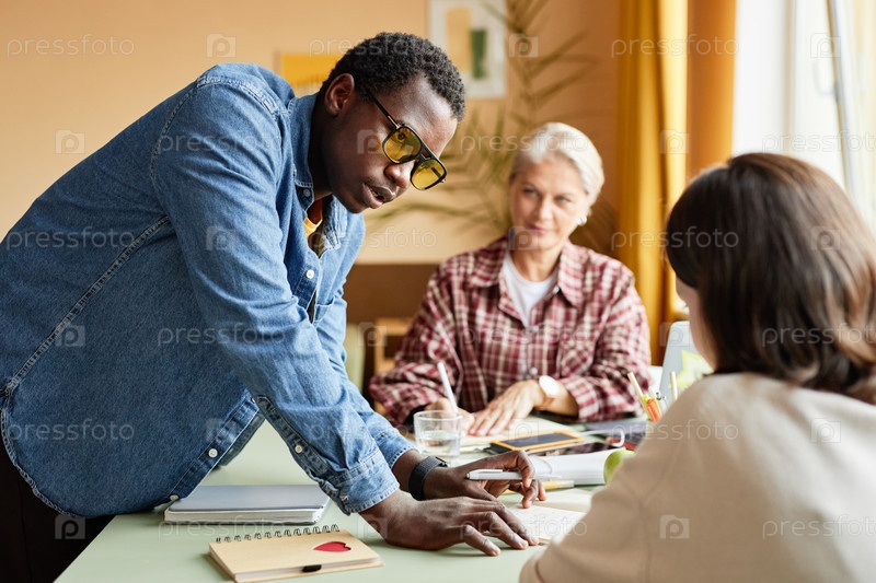Человек в очках разговаривает с коллегой, стоящей рядом с рабочим столом в офисе