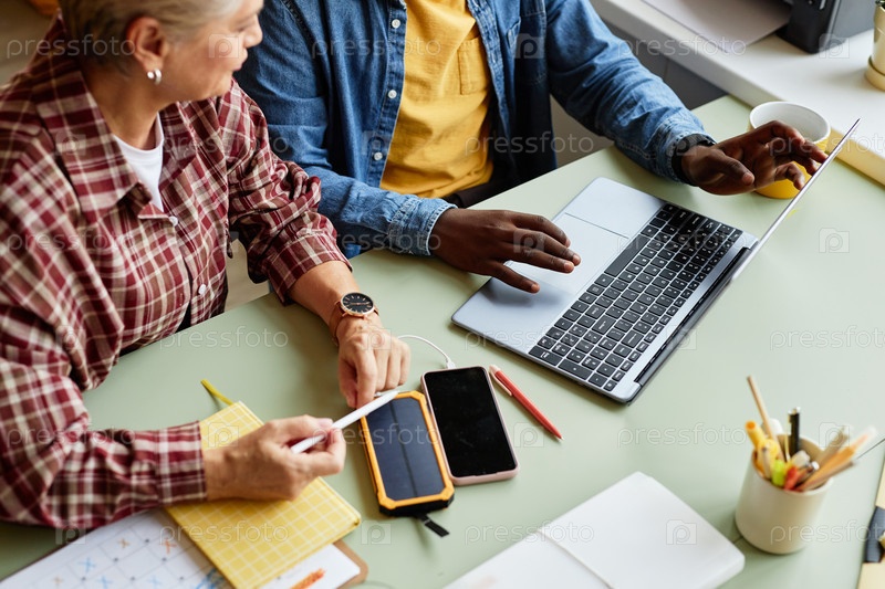 Чернокожий мужчина помогает старшему коллеге по правильному использованию ноутбука за столом в офисе