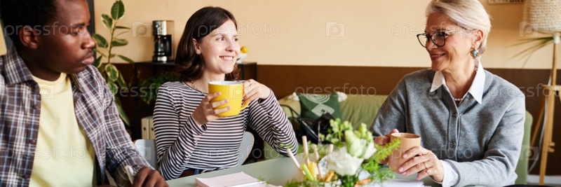 Header Image of Разнообразная команда улыбающихся офисных работников собираются за чашечкой кофе на рабочем столе в помещении