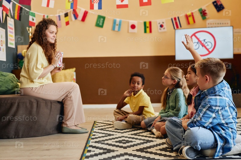 Женщина, преподающая правила безопасности дорожного движения группе детей в школе