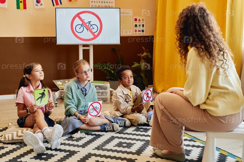 Разнообразная группа детей слушает учителя во время урока безопасности дорожного движения