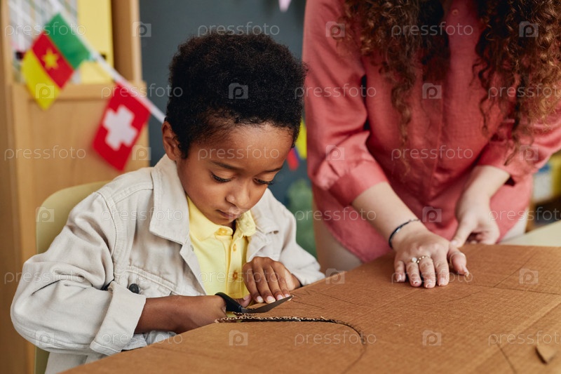 Черный мальчик режет картон, наслаждаясь классом искусств