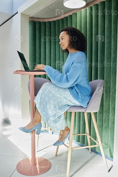 Молодая женщина-офисная работница, печатающая на ноутбуке Работая за стойким столом в Coworking