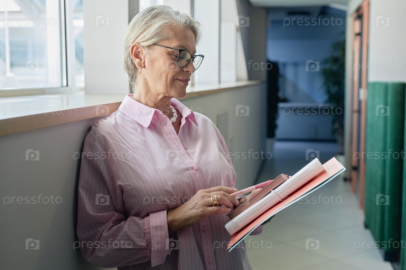 Старшая женщина в очках держит блокнот, стоя на коридоре