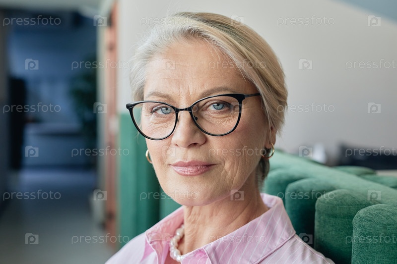 Портрет пожилой женщины в очках, позирующей на коридоре
