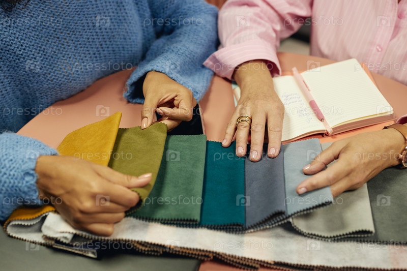 Руки двух женщин-дизайнеров, выбирающих цвет на образцах ткани, сидя за столом