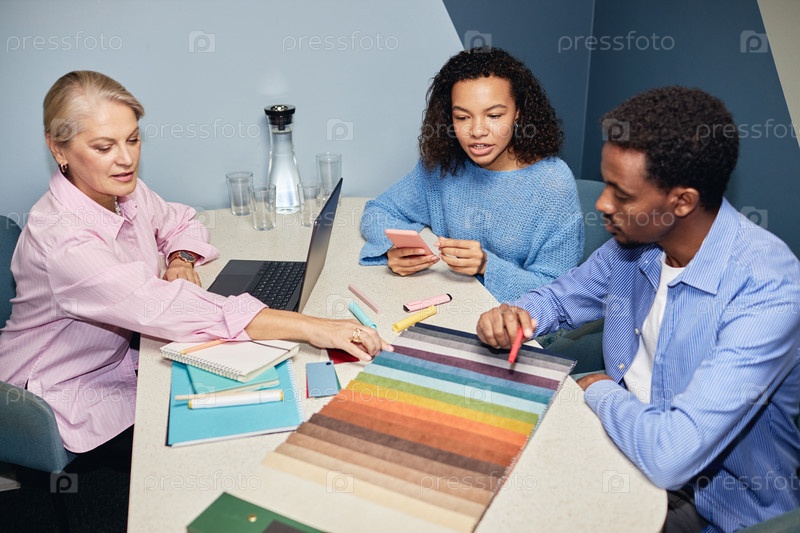 Три дизайнера выбирают цвет на образцах ткани, работая в команде за столом