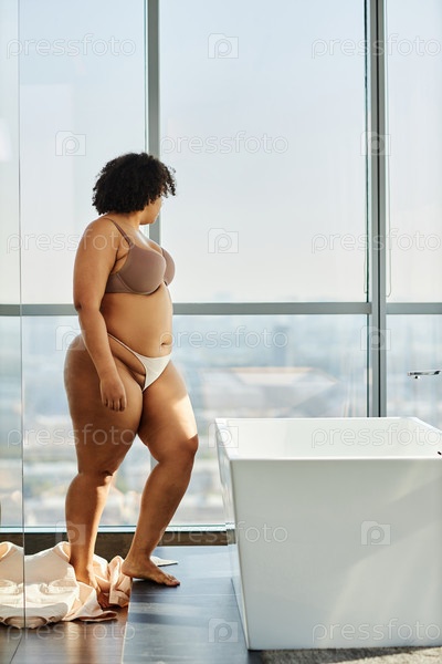 Плюс размер Черная женщина, идущая к ванне в комнате с большими окнами дома