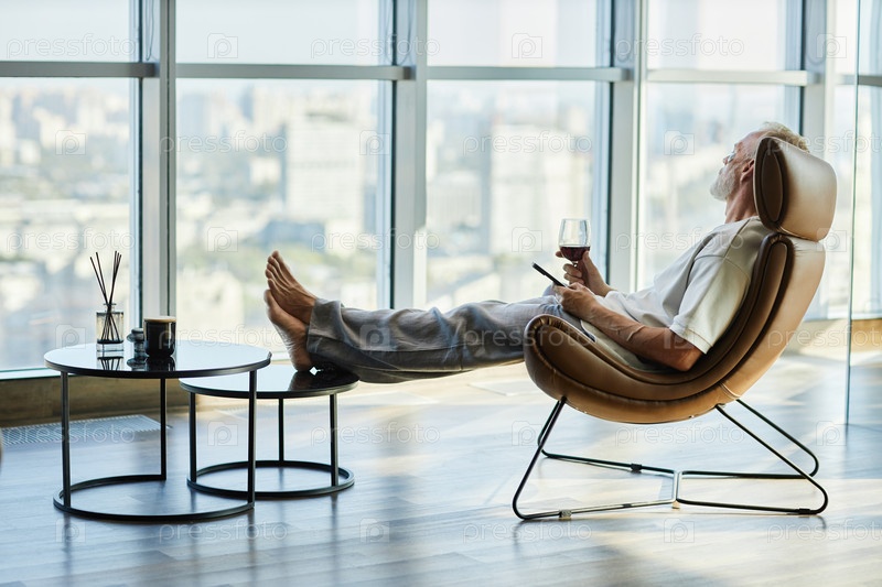 Пожилой мужчина отдыхает в кресле за бокалом вина и смотрит в окно дома