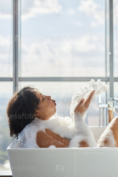 Черная женщина вдыхает пену из рук, развлекаясь во время расслабляющей ванны дома