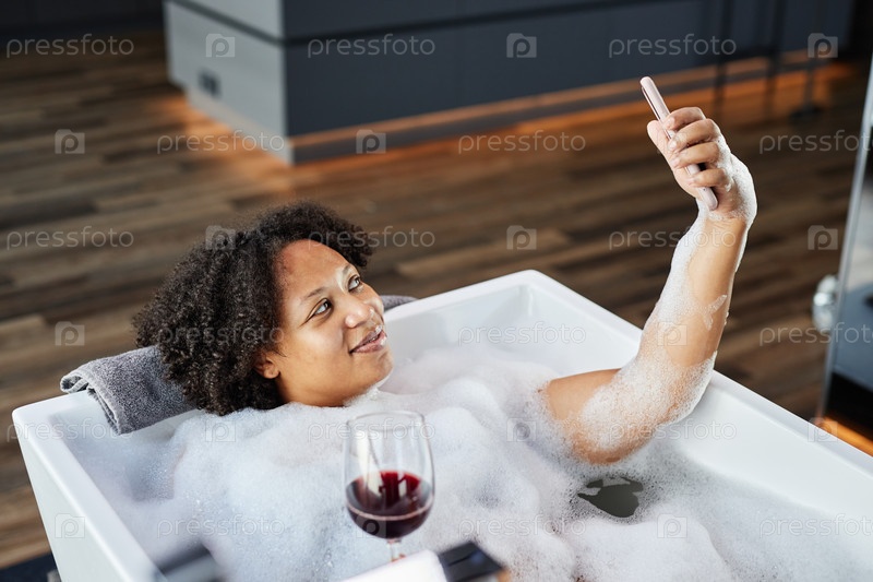 Улыбающаяся чернокожая женщина видео звонит по телефону, держа вино лежит в ванной дома