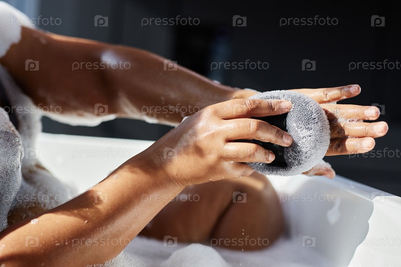 Руки чернокожей женщины массажируют кожу ванной губкой в помещении