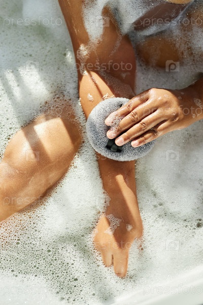 Руки чернокожей женщины, моющие кожу губкой для ванной во время очистки тела в помещении