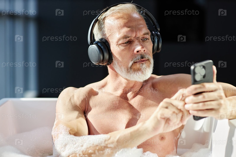 Портрет зрелого мужчины, слушающего музыку на наушниках в то время как он лежит во внутренней ванне