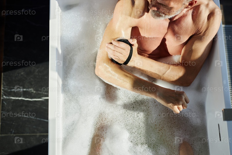 Зрелый мужчина протирает кожу губкой, принимая ванну во время рутины ухода за телом в помещении