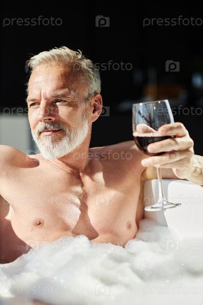 Улыбающийся пожилой мужчина держит бокал вина, пока занимается пенообразной ванной в помещении