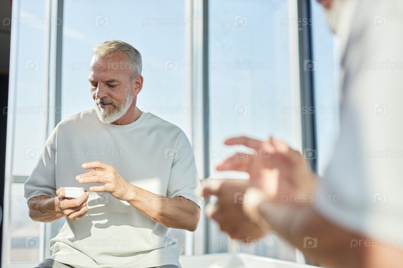 Зрелый мужчина держит кружку с кремом, увлажняющую кожу во время рутины самообслуживания в помещении