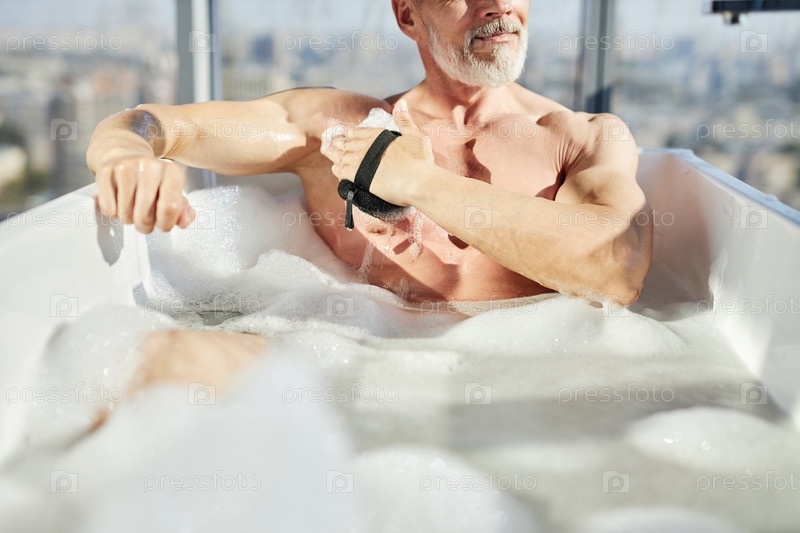 Голый мужчина массажирует кожу туловища с помощью ванной губки для мытья тела в помещении