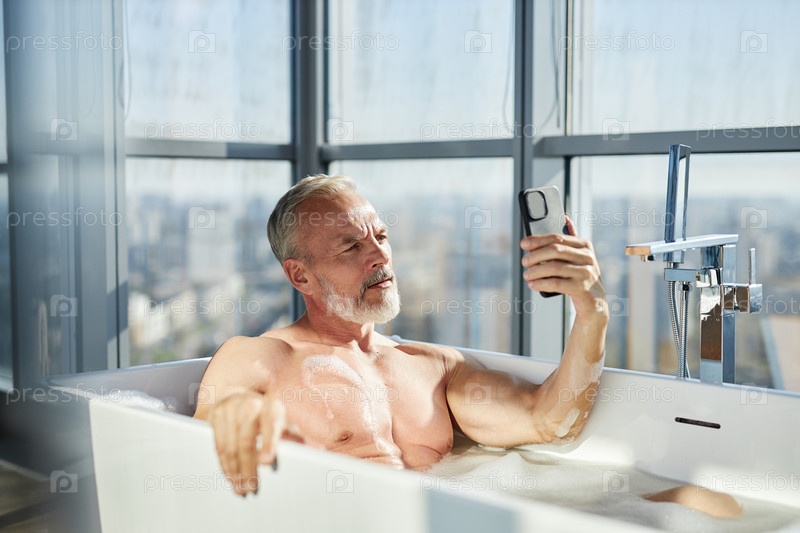 Мужчина среднего возраста снял селфи, лежа в расслабляющей ванне дома