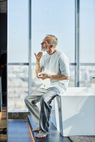 Зрелый мужчина, носящий домашнюю одежду, наносит крем на лицо, сидя в ванне внутри