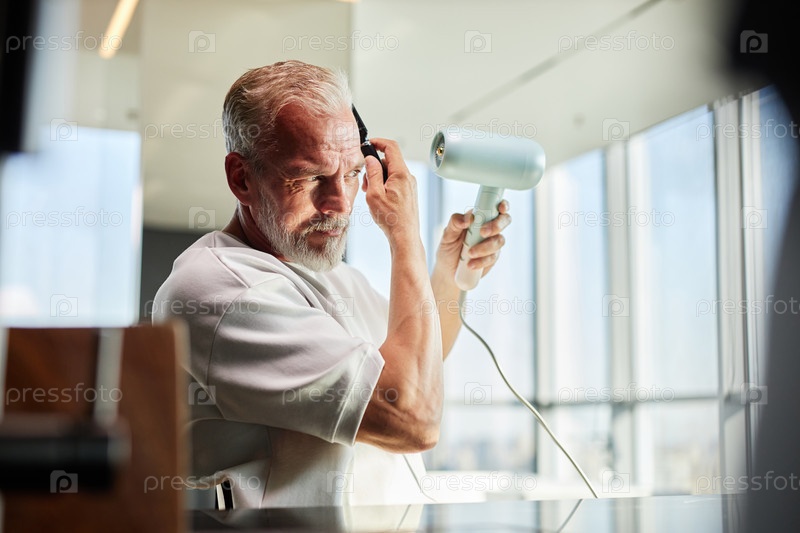 Старший мужчина чистит волосы и использует сушилку во время рутины самообслуживания дома